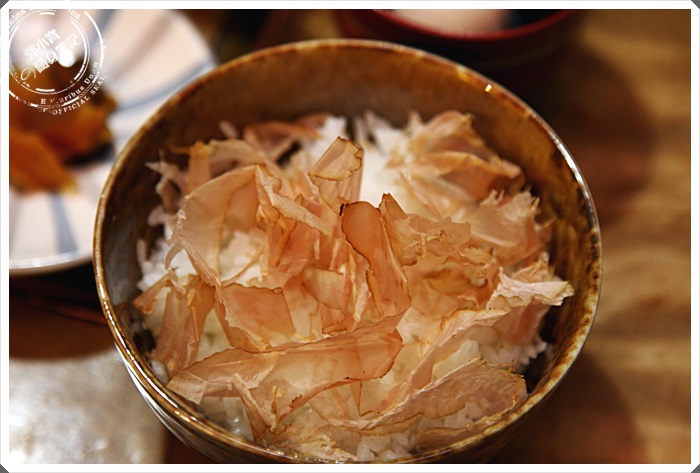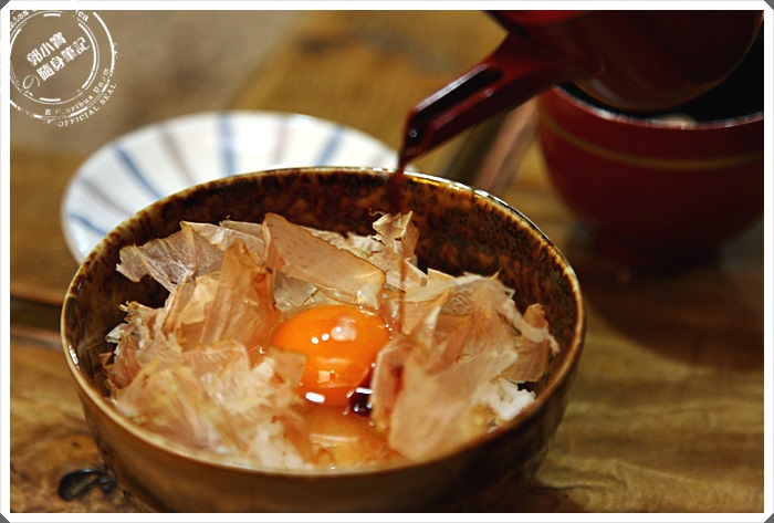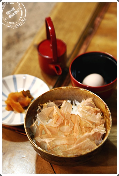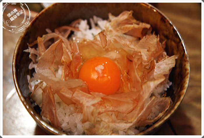 | 500日幣的一份餐其實在日本算是相當相當的便宜,雖然內容物沒有甚麼,但是我以為在這樣的老店裡面隨便一個餐都有2000日幣以上,但是其實怎麼點都相當的平價,熱騰騰的白飯上灑滿了柴魚片,透著陣陣的香氣,趁快把整顆蛋打在碗裡,幸好平常在家裡面煎蛋還算夠多,所以一出手才可以把蛋打的如此完美無缺。 |