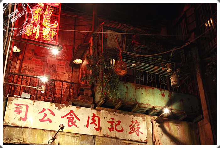 | 沿著街道走到了盡頭,眼前的紅光讓整個詭異氣氛達到了高點,店面上的字體都是熟悉的繁體文字,破舊的鐵皮屋呈現出當時的違章濫建。 |
