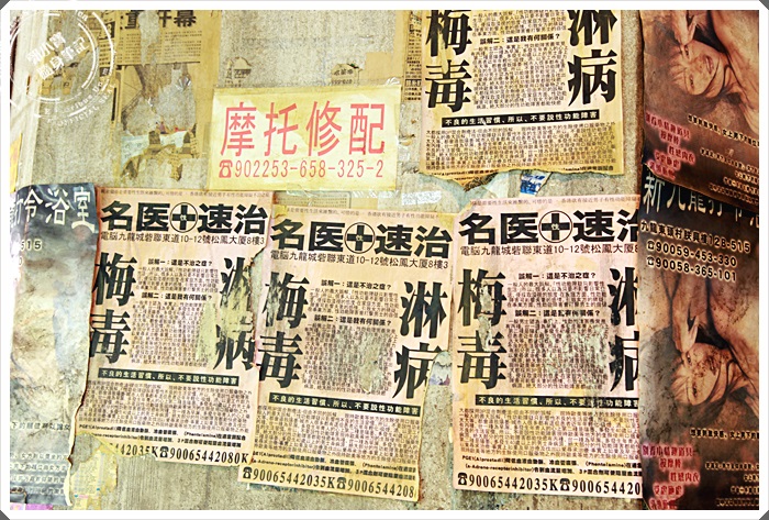 | 一個小角落也能讓我那麼的有感覺,消防設備其實是新的,只是外表依然鐵鏽爬滿整個蓋子,家門口貼滿了廣告宣傳單,在當初的九龍城寨似乎沒有一面牆壁是可以完整如初的,幾乎都是被各式各樣的廣告單占據了。 |