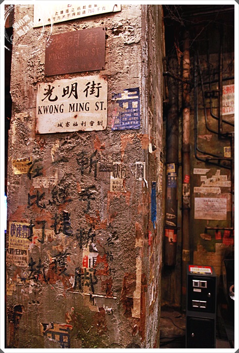 | 破舊不堪的水泥柱上貼著光明街,這一條街當初在九龍城寨可真的有這一條街,水泥柱上的斑駁泥塊訴說著九龍城的歷史,這被外國人讚嘆的建築美學終於消失了,現在只能到這裡懷念當初的九龍城寨。 |