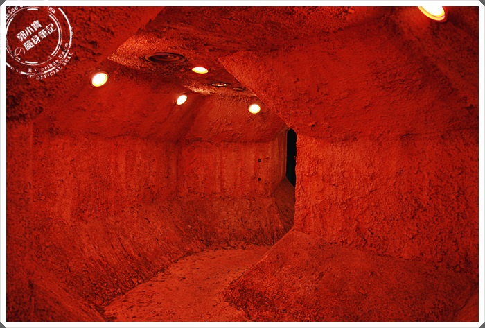 | 另一個出口就打造成下水道的隧道的感覺,在曲折的隧道內達到水池旁,必須踩著石塊往前進,門的那邊就是停車場了!!! |