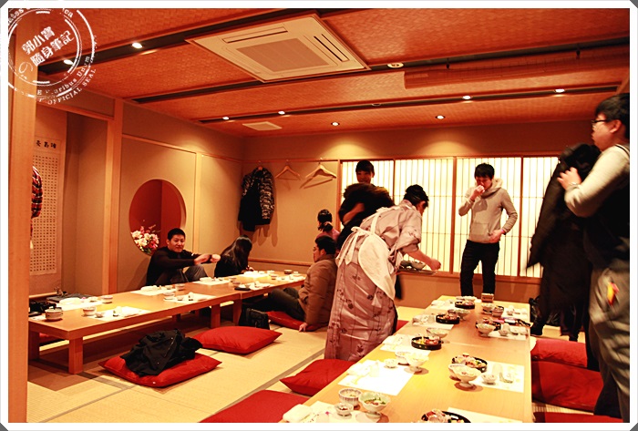 | 一樓是吧檯桌,女將將我們帶到2樓的包廂,這次團體自助出遊因為人數高達16人,所以才會請日本人幫我們訂一間晚宴餐廳。 |