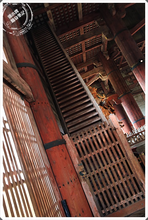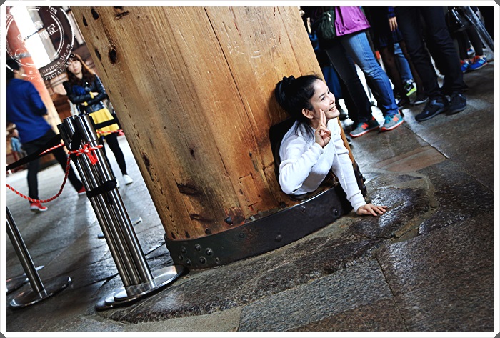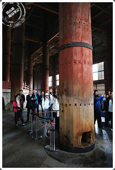 | 寺內的木柱,這也是東大寺的特色之一,據說可以在立柱中間小洞穿越的人會保佑身體健康之類的,所以很多人都會鑽鑽看自己是否可以穿越這個小洞。 |