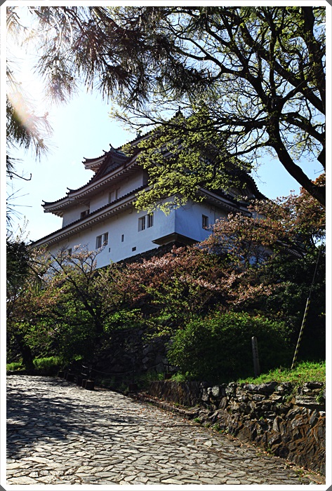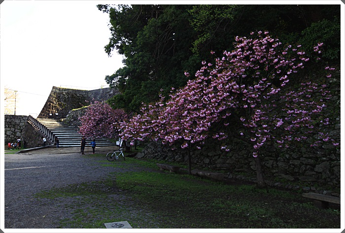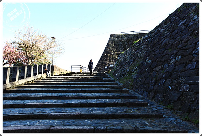 | 準備爬最後的石階上天守閣,一旁的櫻花樹也正盛開著,但是只有幾顆而已,頂下的櫻花林比較盛大。 |