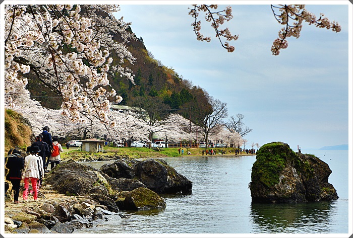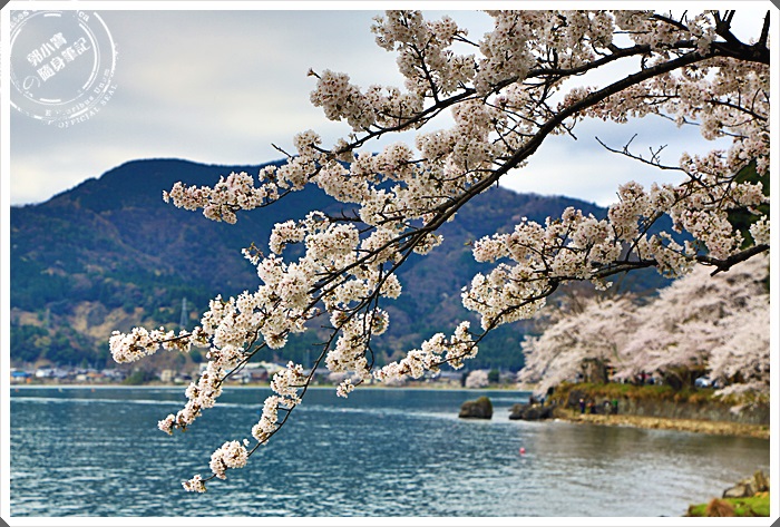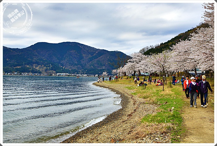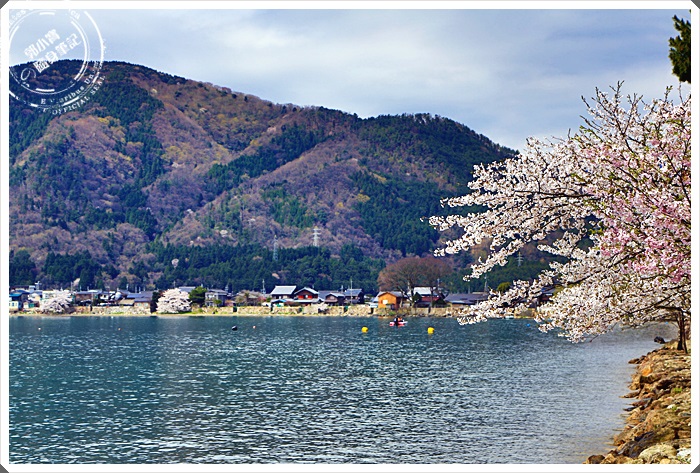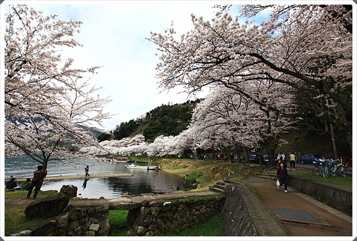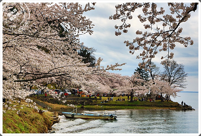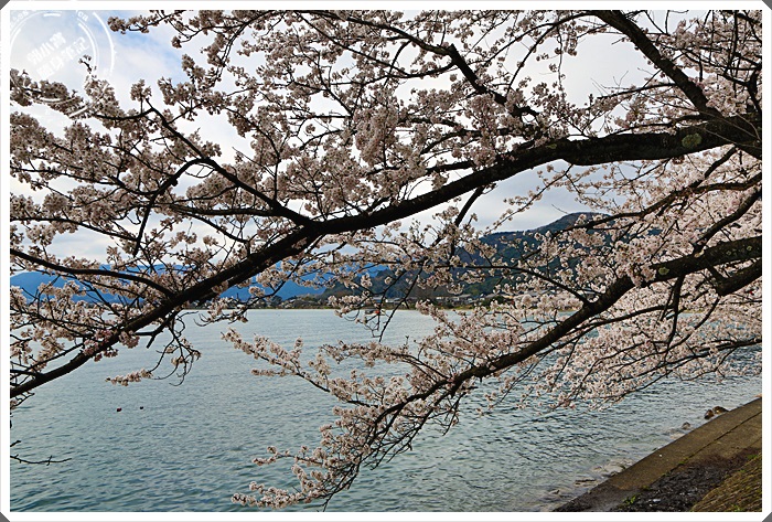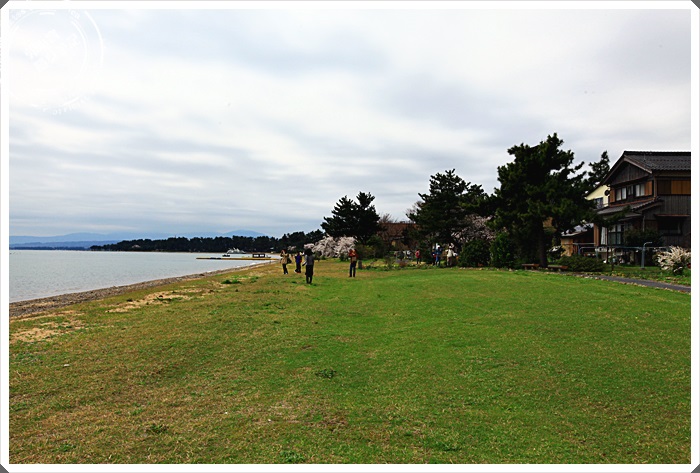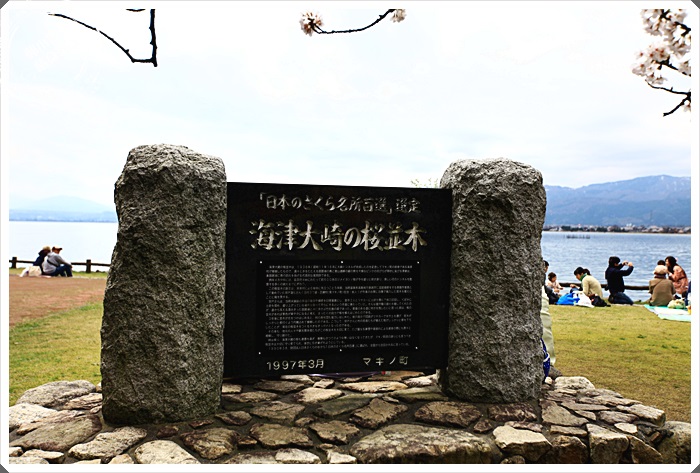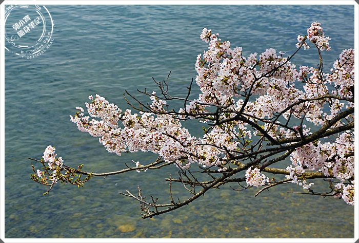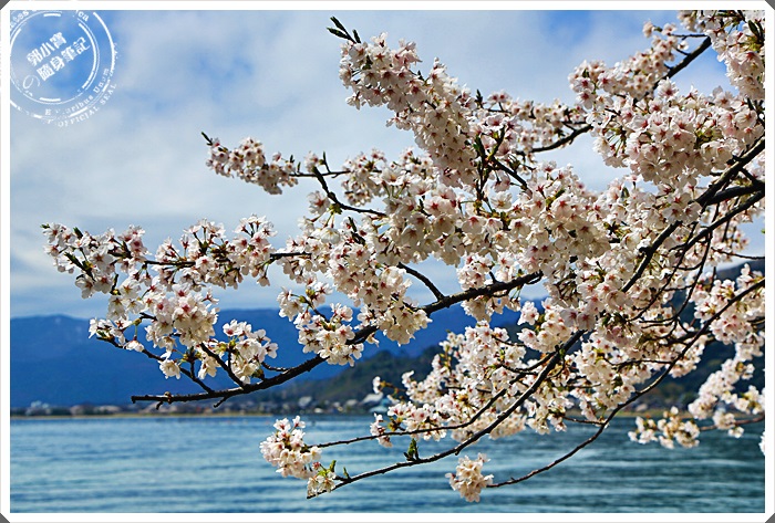 | 從另一邊透過櫻花望向湖畔又有另一種美景,似乎是那麼寧靜般的愜意,這倒是我第一次感受到這樣的櫻花美景,一望無盡的琵琶湖就像是大海般,據說夕陽的時候海津大崎更是美到不像話,但是這樣的美景比較適合自駕車的朋友,我們則是無緣見到,不過一路走來欣賞到的美景已經夠我滿足了。 |