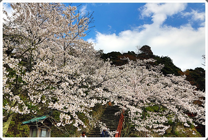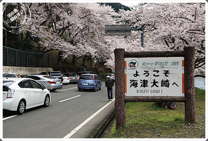 | 跟著海津大崎路線懶人包的路線就會到達海津大崎的起點,從這邊起幾乎兩旁都是櫻花盛開了,這招牌當然也是很多人一定要合照一下的。 |