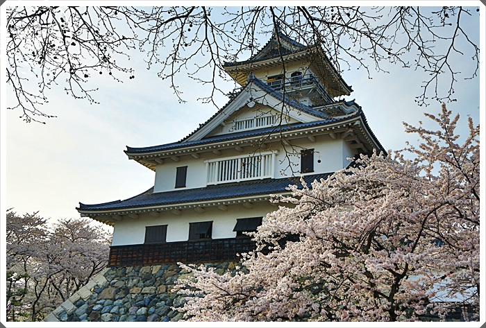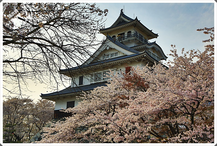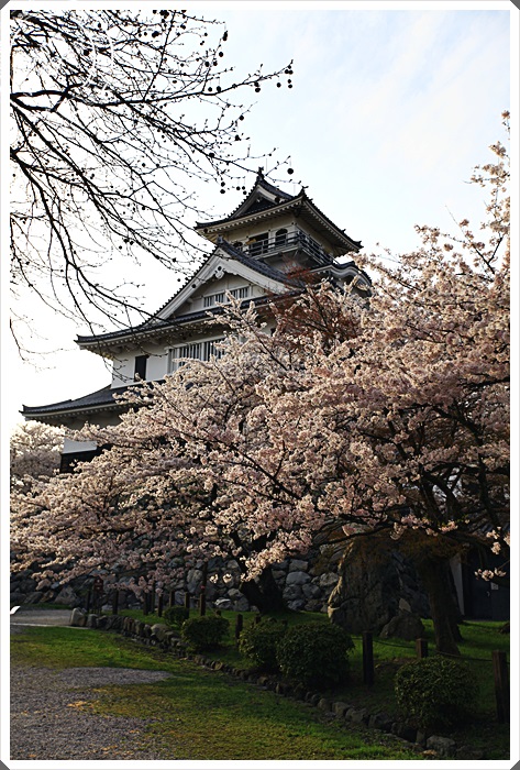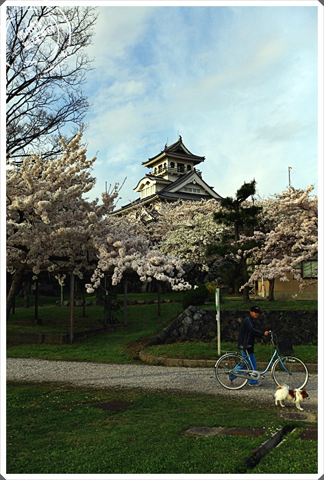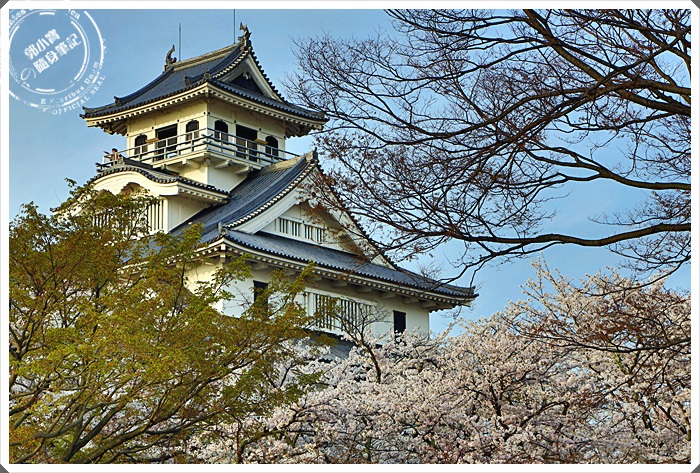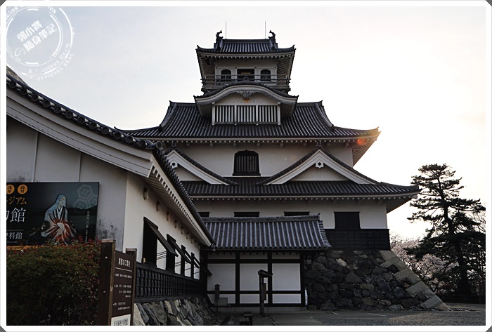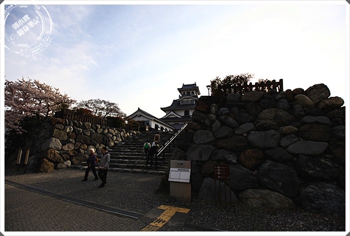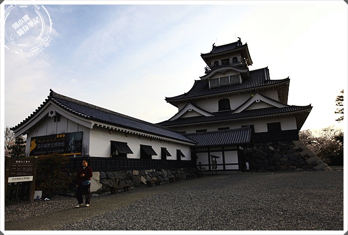 | 沿著階梯來到了長濱城的天守閣,雖然是後來才復建而成的,但是看起來還是相當的古色古香,可惜我們到達的時間天守閣已經到了關閉時間,所以不得其門而入,但是我們今天最主要的目地還是櫻花跟夕陽。 |