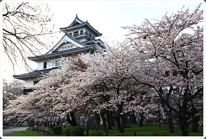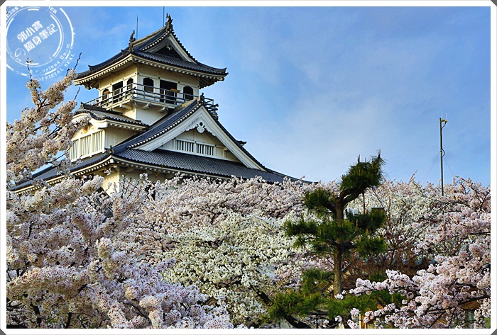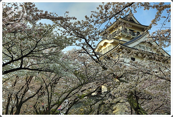 | 難怪長濱城可以被列入日本10大櫻花名城,真的是美翻天了阿,前後都被櫻花包為了,露出了天守閣的尖塔,從另一個角度櫻花空隙中的長濱城有著令人屏息的美。 |