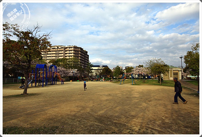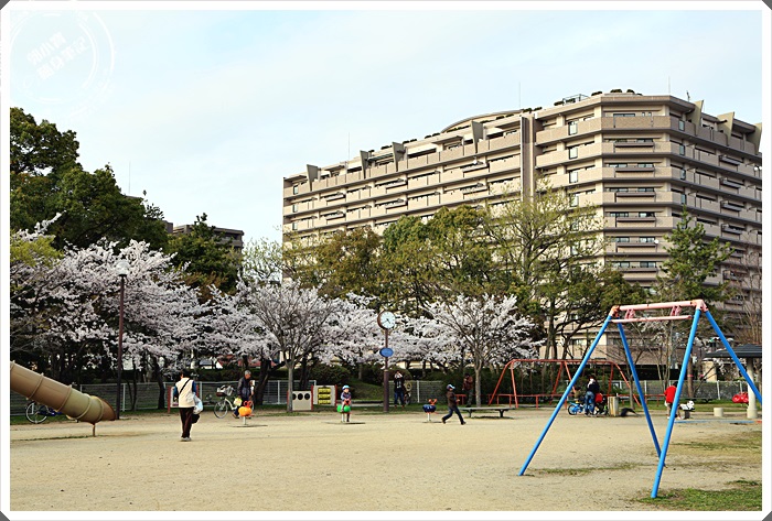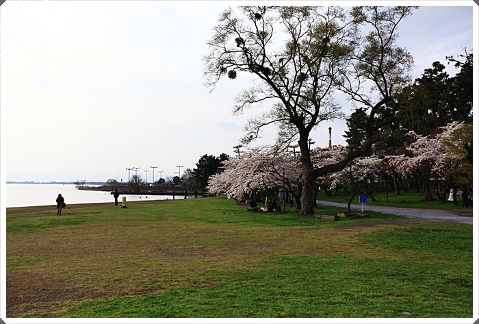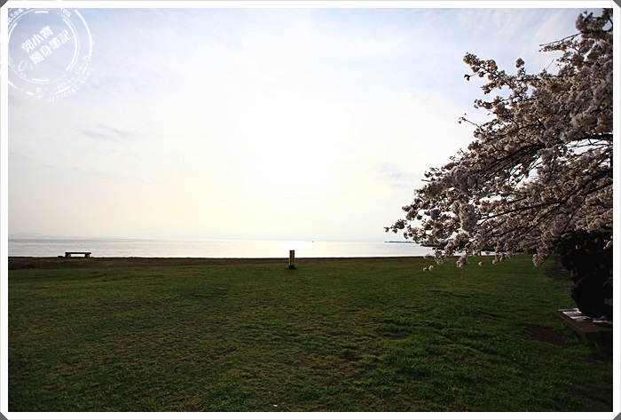 | 入口處的沙公園就可以看到一整排盛開的櫻花了,但是這樣櫻花的數量在日本算是隨處可見,但是看到門口櫻花正好盛開讓我們相當的開心,果然捨棄陰雨綿綿的京都轉戰滋賀縣是正確的選擇。 |