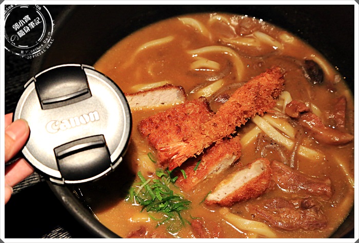 | 分別拿出我的大手機跟鏡頭蓋來當一下比例尺,這一碗烏龍麵真的超大碗的,重點是碗底又相當的深。 |