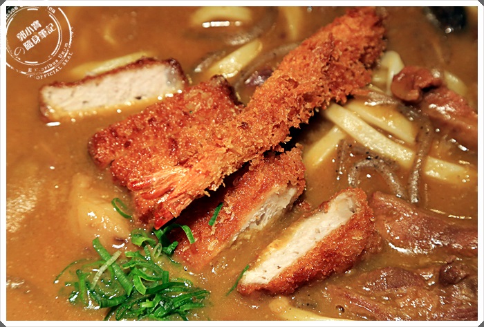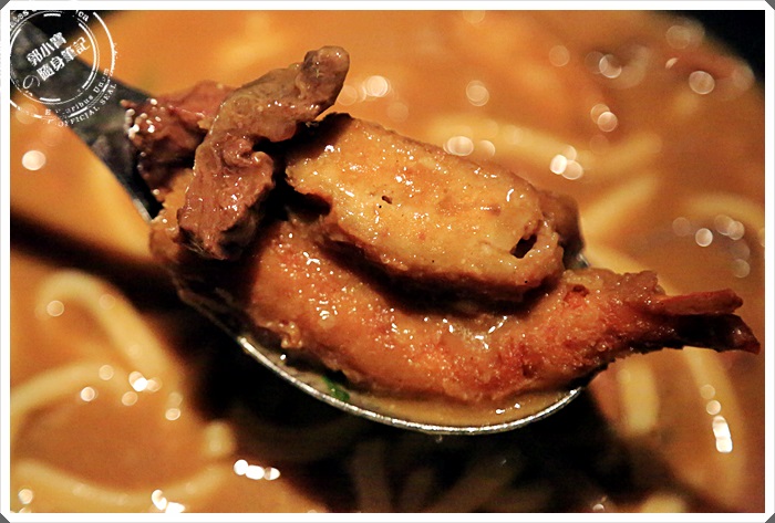 カレー三昧のおうどん的意思就是裡面有炸豬排、炸蝦、跟牛肉三種麵料的咖哩烏龍麵,沾上濃郁咖哩的炸蝦跟炸豬排粉皮都有一點濕糊的口感,這口趕我個人不是很喜歡啦,但是MOMO還滿喜歡這樣的口感的,牛肉也相當的軟嫩還不賴,整碗吃下來我還挺滿意的