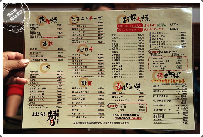 | 兩片都是食材的菜單,比起一般的大阪燒豐富了許多,除了套餐的選擇以外,背面還有許多單點食材的選擇。 |