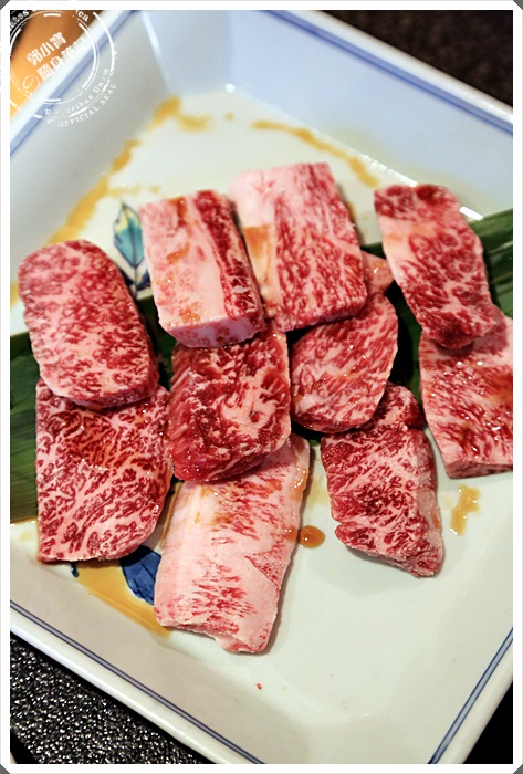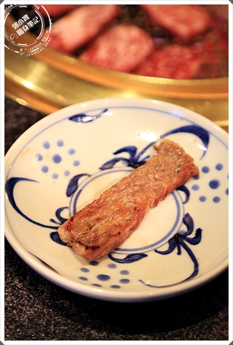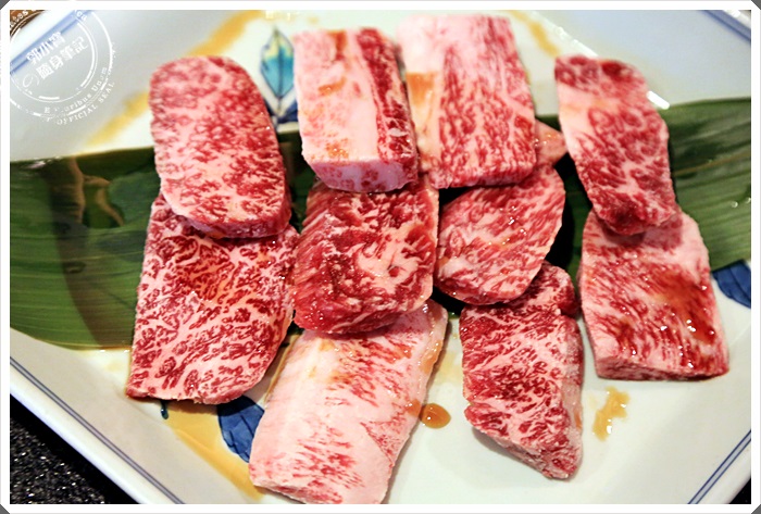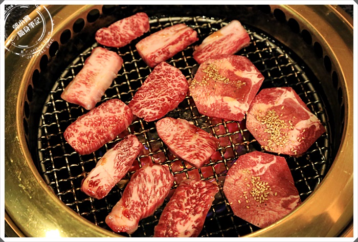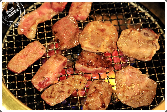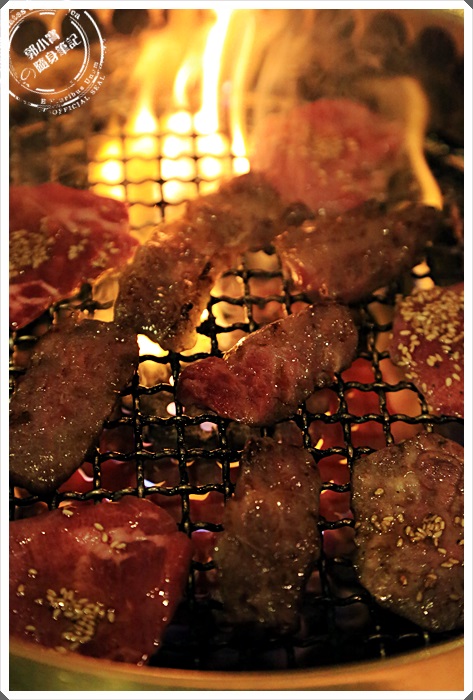 | 看看這烤盤上的松阪牛,幾乎每一片肉的雪花都漂亮到一個誇張的地步,炭火一烤之後那香氣逼人,油脂低落到木炭燃起的火焰真的是超歡樂的!! |