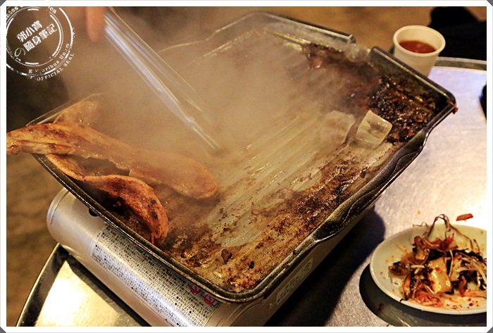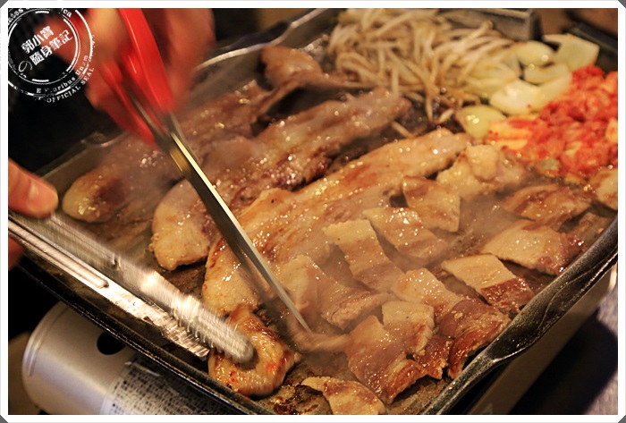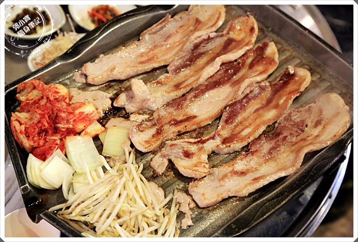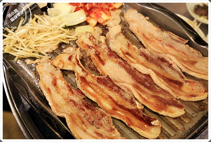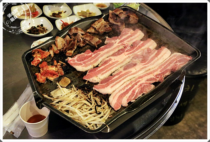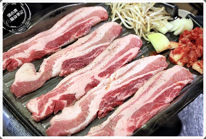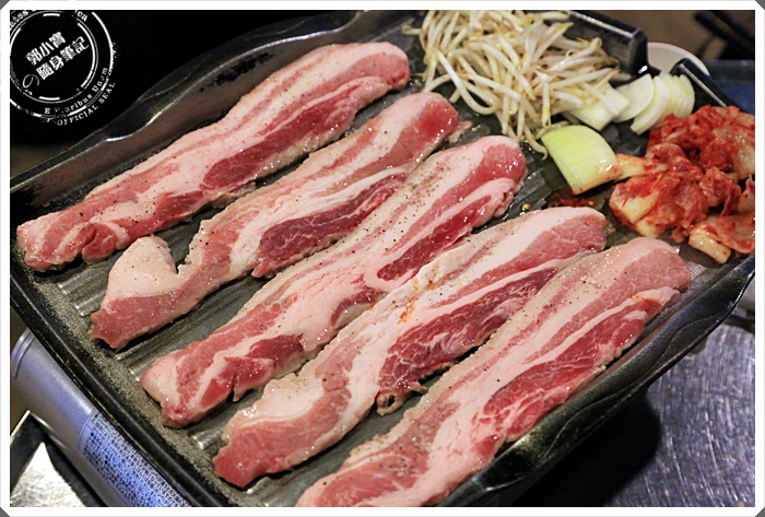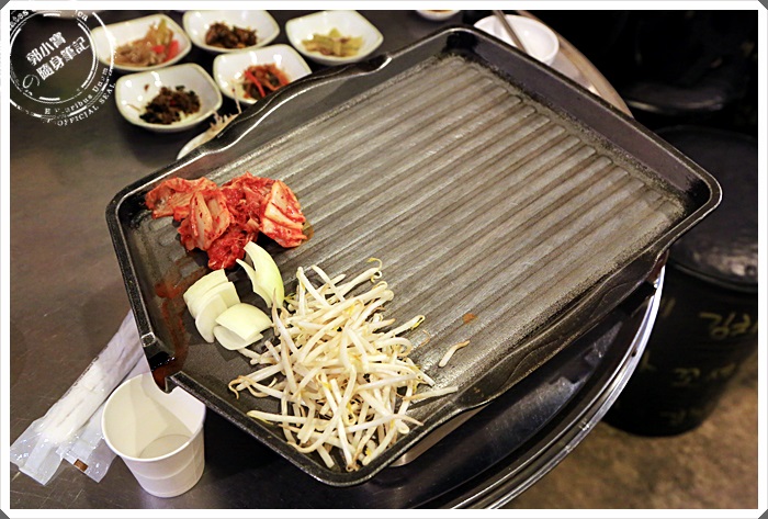 店員俐落的就送來了一個鐵盤,鐵板是斜的,方便等等烤肉的油脂可以從中間的孔洞流出,鐵盤下方放了豆芽、洋蔥、泡菜,這些也是可以無限量供應。