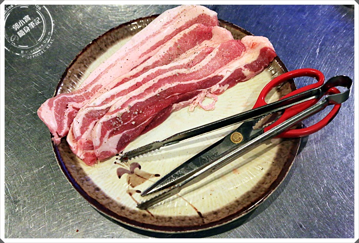| 隨著豬肉上桌後,還會給夾子跟一把剪刀,剪刀相當的利,剪肉跟剪紙差不多,因為我們進入的時候沒有甚麼客人,所以店員就一直幫我們服務,我們只要動嘴就好了,開心! |