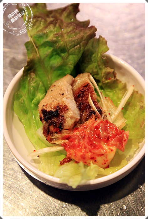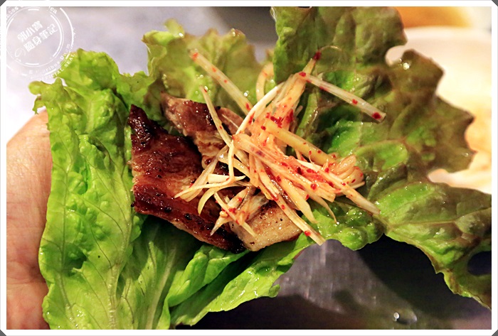 | 生菜夾豬肉配上辣刺蔥的感覺也不錯,其實是因為泡菜都被我瞬間夾完,店員來不及補充新的泡菜,我只好先拿辣刺蔥來搭配,但是整體還是搭泡菜比較美味。 |