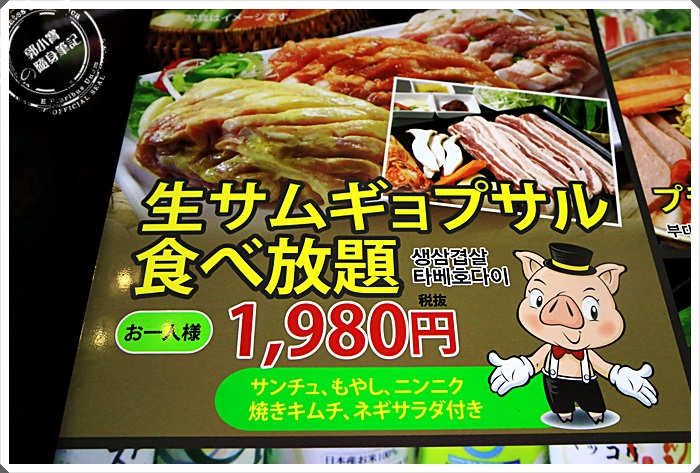門外的招牌有好多美食,本以為這些都是在吃到飽的選擇內,這樣的話也太划算了吧,詢問了一下店員後才發現,吃到飽的選項只有指的是韓國燒肉的部份,而且只有豬肉一種選項,本來想說這樣也好,豬肉搭配其他菜色應該可以把我們養的很飽,但是幸好momo阻擋我點其他菜,因為光是肉就已經塊塞飽我們了!