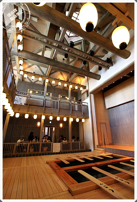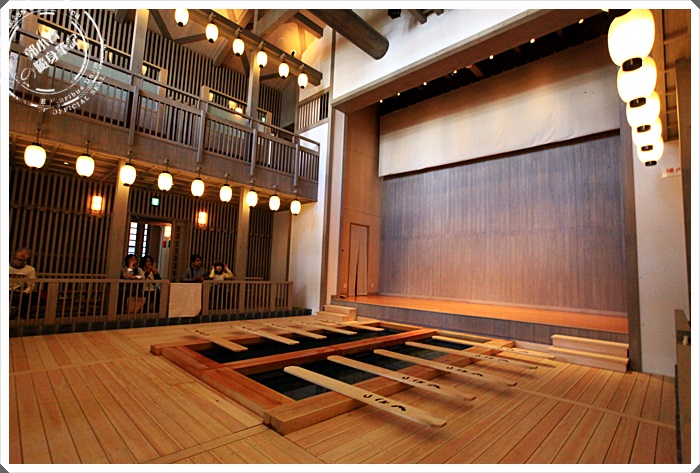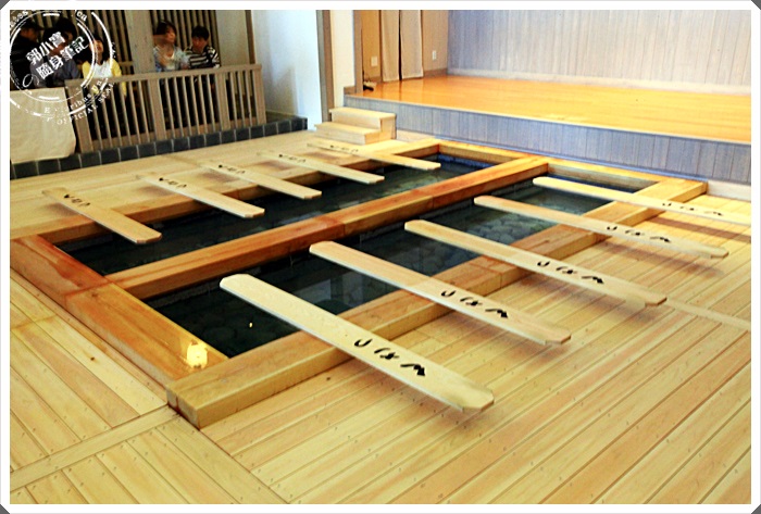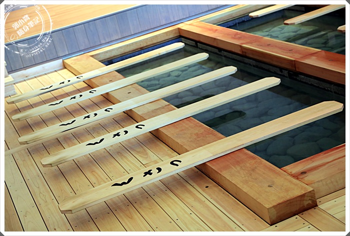 | 我們相當幸運地坐在一樓的第一排,視野景觀都相當的好,重新翻修過的熱乃湯散發著木頭的香氣,溫泉池旁放了幾個像是木柄的東西,這個就是等等揉湯表演的器具。 |