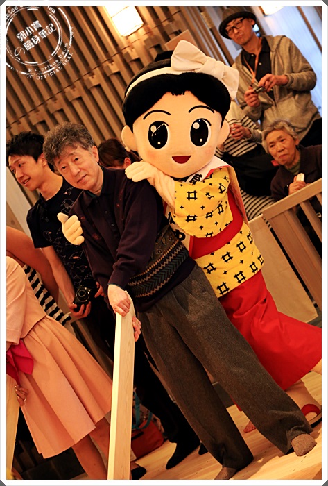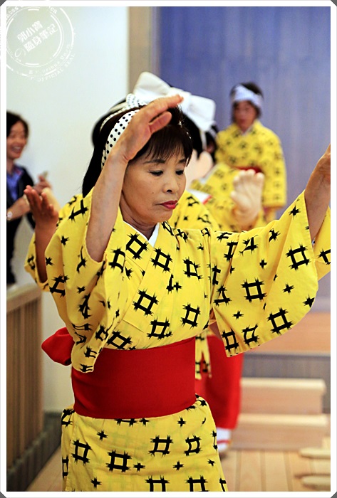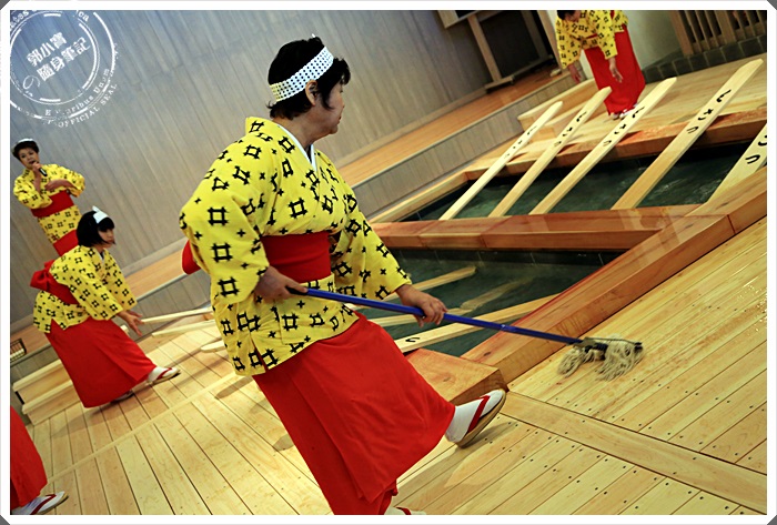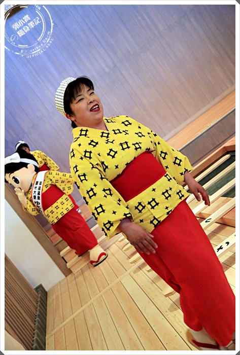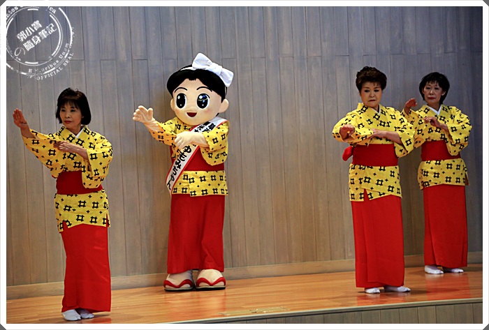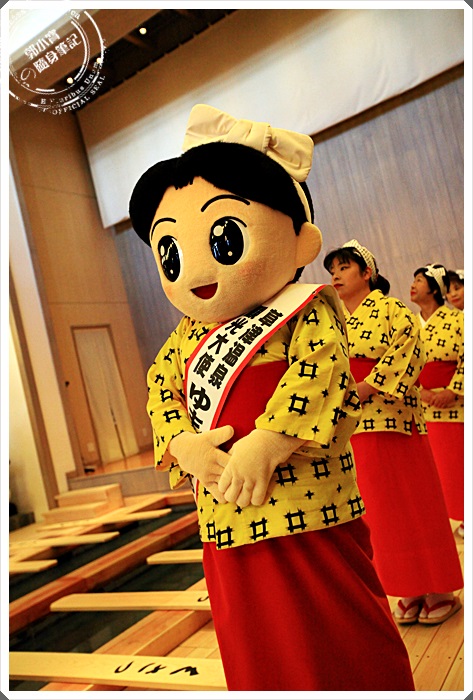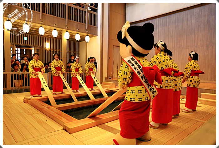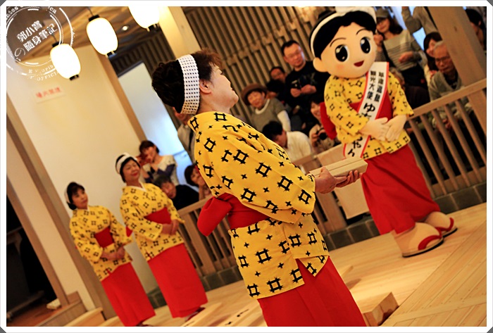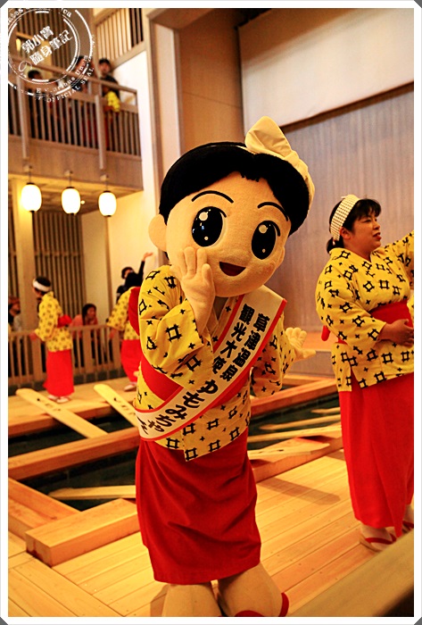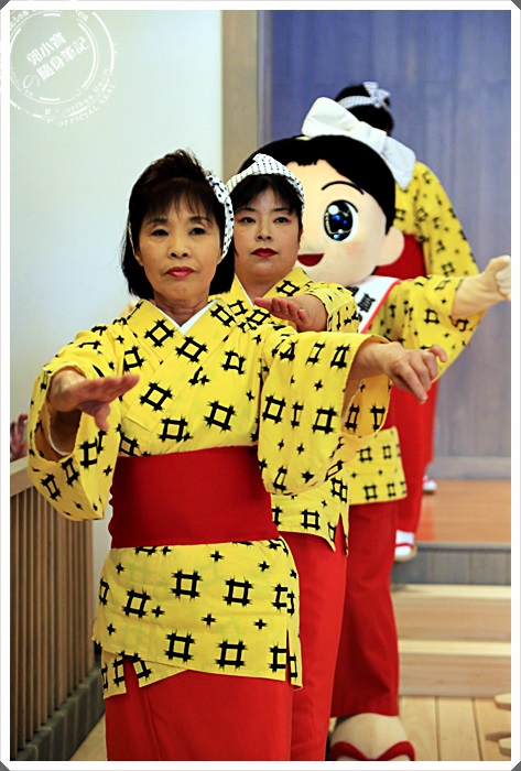 | 接著大嬸們跟草津溫泉的代表吉祥物『湯もみちゃん』(yumomi醬)一起出場表演草津傳統舞蹈,這時候才不會開始表演揉湯。 |