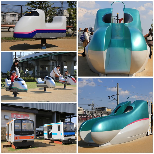 | 有各式各樣的電車造型遊戲器材,搭配著好天氣小朋友每個都玩得超開心的,新幹線溜滑梯搞得我也好想去溜一下的說! |