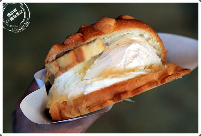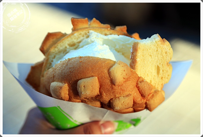 | 波蘿麵包本身就很好吃,鬆軟可口加上上面的酥皮塊較大,所以不管是口感還是香氣上都是上等,裡面的冰淇淋感覺是香草口味,但是甜度不會很高,吃起來還滿爽口的,有附上一塊小麵包,可以先把冰淇淋挖起來吃一些,然後再夾著波蘿大口咬。 |