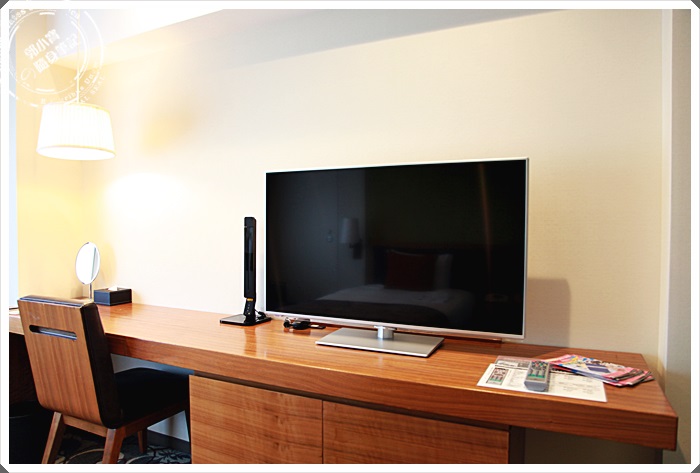 | 長形書桌上面有電視,我喜歡長形書桌,因為我出門都還是會帶很多店子商品,晚上一回飯店還要開電腦、沖相機電池、手機、行動店員等等,長型桌方便我一字排開。 |