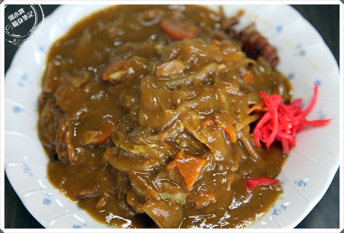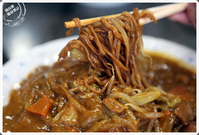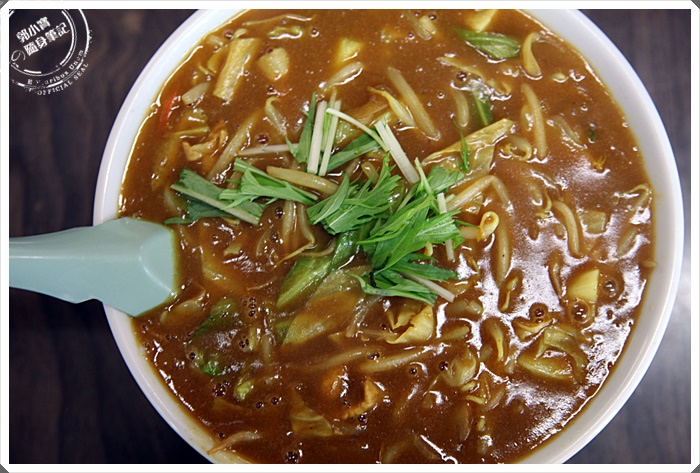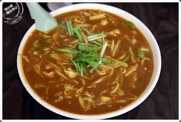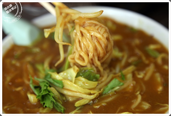 | 濃郁的咖哩湯汁基本上喝了一口會覺得爆膩,但是咖哩香氣卻是相當濃郁,咖哩屬於甜咖哩,混合了大量的蔬菜跟豆芽還有豬肉片,麵條是厚麵條,有點像是烏龍麵跟太麵的綜合體,吃起來帶點咬勁,麵條上吸附的咖哩醬汁相當美味。 |