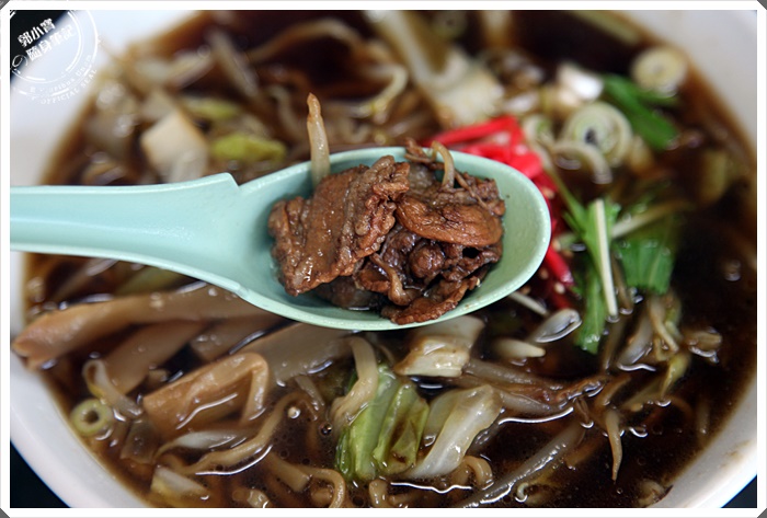 | 肉片似乎已經滷製滿久了,建議搭配麵條一起入口,單吃肉片的鹹味太重,麵碗裡面的配料都是一樣有大量的蔬菜跟豆芽還有豬肉片。 |