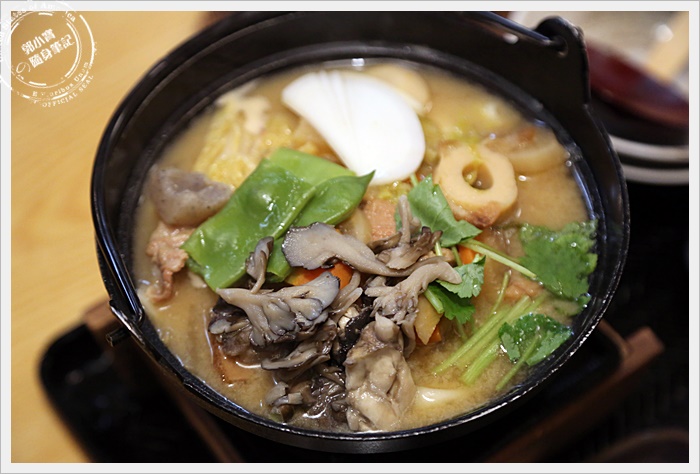 | 打開後香氣撲鼻,鍋裏面還有大量的野菜跟菇類,老實說要在日本吃到大量的蔬菜真的頗為不容易,日本常吃的時候看來看去蔬菜類幾乎都是醃製類,加上群馬縣草津的特製味噌,味噌湯頭喝起來帶點甜味。 |