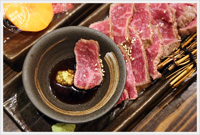 | 生牛肉將外皮炙燒過後再沾著芥末醬油,有是相當的美味,外脆內軟的口感非常的順口。 |