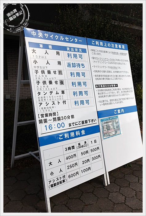 | 租腳踏車的價目表,滿建議租一整天也才五百日幣真的很划算,比起台灣的租腳踏車費用真的太划算了。 |