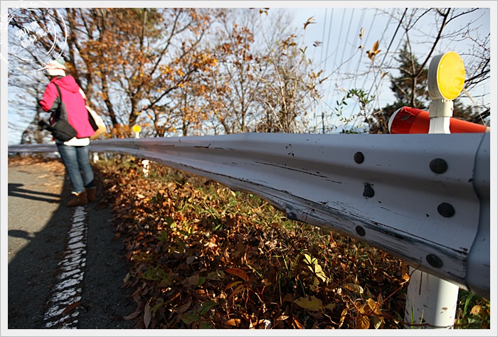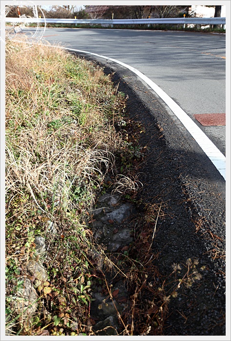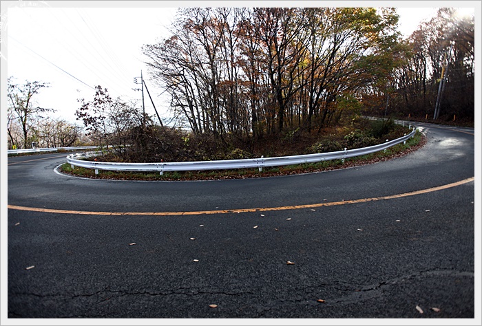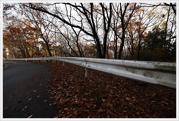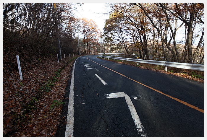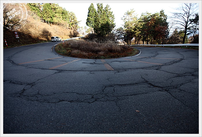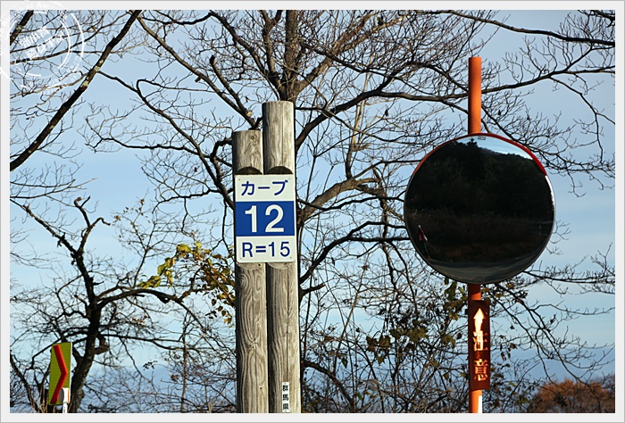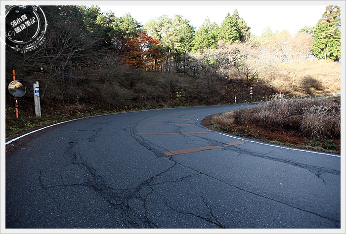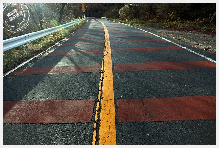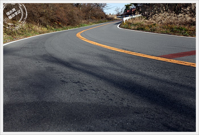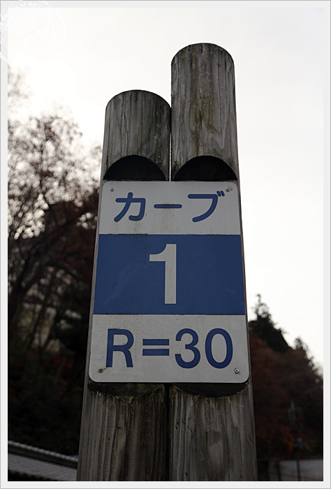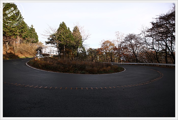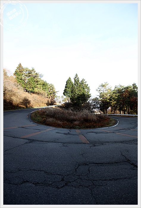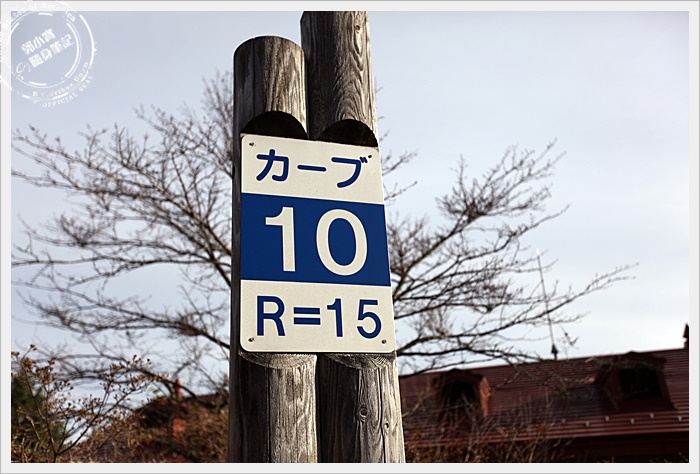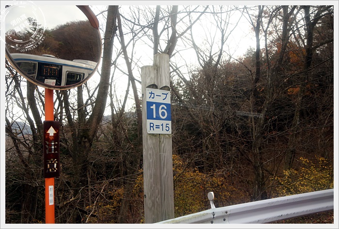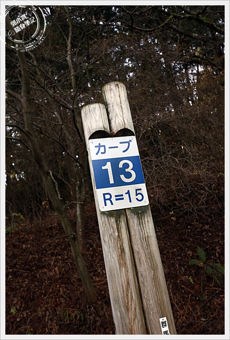 | 每個彎道都有標明弧度的範圍,我們就一邊聊天一邊當作散步走下山,然後再搭公車上車到榛名湖,真的有點搞笑。 |  |