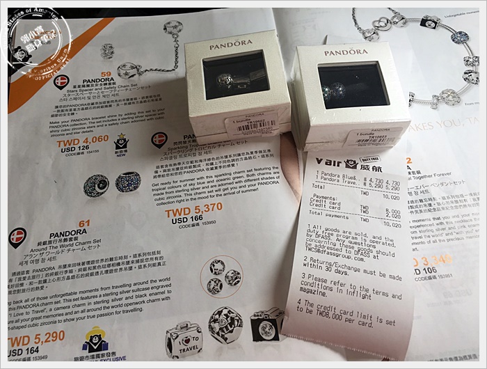 | 回程的時候翻了一下免稅品購物雜誌,很多東西真的都很好買,價位也很便宜,尤其很多商品都是跟vair威航聯名合作的,當下我就買了兩套的潘朵拉,不過有一個小問題就是,vair威航的機上購物信用卡一個人一張卡最多只能刷8000,如果想瘋狂買機上免稅品的朋友可能要多帶幾張卡,不過免稅品的商品大多價位是900~4000價位居多。 |