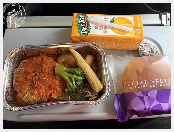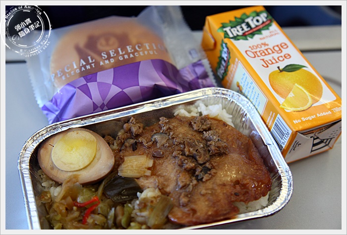 | 機上餐點選擇相當多,我去程是吃排骨飯,分量剛剛好不會太飽或是太少,味道也相當不錯,這大概是我目前吃過好吃的廉航餐點,都會搭配一個vair威航銅鑼燒跟柳橙汁,排骨相當入味,回程的漢堡排也很可口,整體上我很滿意XD |
