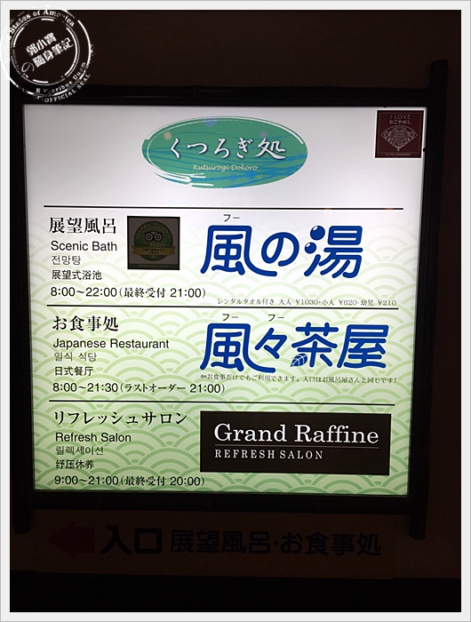 | 浴場不能拍照,所以只能拍一下門口跟大家分享了,說真的在登機前來這邊泡一個舒服的溫泉真的事很特別的體驗,有生以來第一次的溫泉體驗,泡完溫泉後上機睡覺,一醒來就到台灣了,把這幾天跑行程的疲勞一次去除。 |