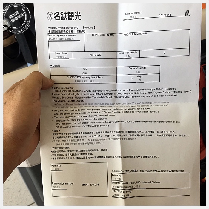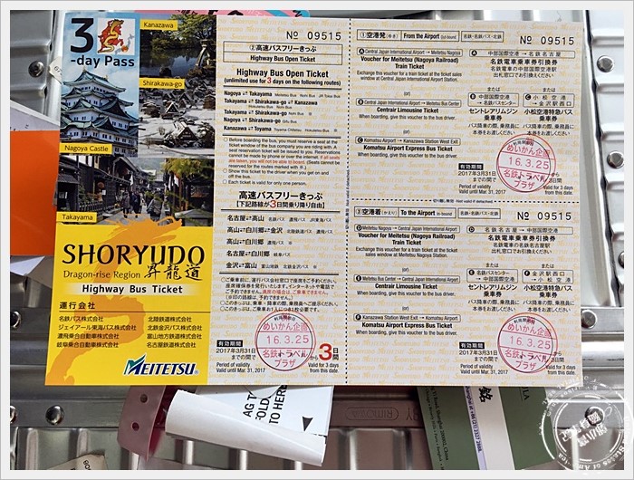 接下來就是昇龍道的懶人包了,其實也沒有甚麼懶人包啦,中部機場主要四通八達,去哪個地方都很方便,昇龍道高速巴士套票是來中部地區許多人都會考慮的交通方式,我們是在網路上預訂3日套票,價格還算便宜,中部地區很多地區都適合一天跑一個點,我們跑了高山、下呂等地方都是靠這高速巴士移動。