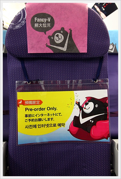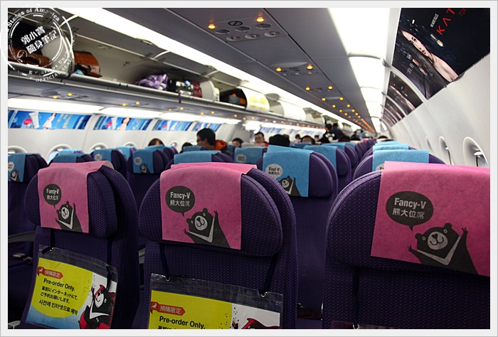| 最前排的是粉紅的熊大座椅,但是我不是坐第一排,所以不太清楚第一排的熊大座椅有甚麼特別的待遇,算是飛機上的商務艙感覺還是吃的比較好之類的?? |