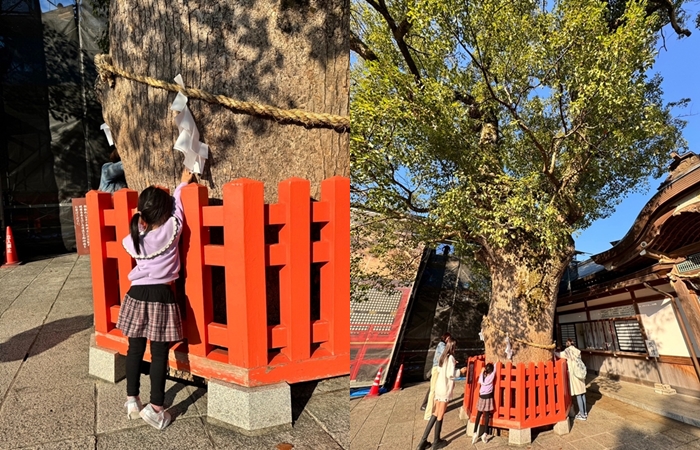 | 讓人最有印象的就是這大樹,通常日本的樹木只要是綁上麻繩並且有白紙片,就是代表這棵樹已經有神靈了,也是神明的靈樹,據說摸了她的樹幹就可以賺大錢呢! |