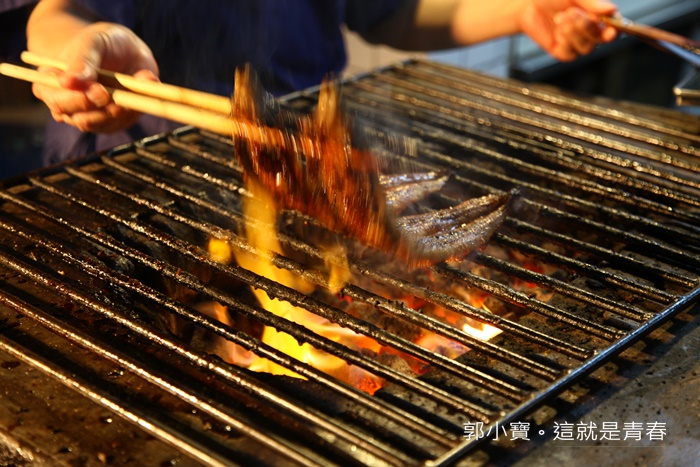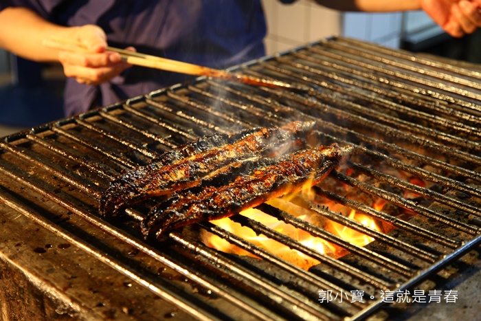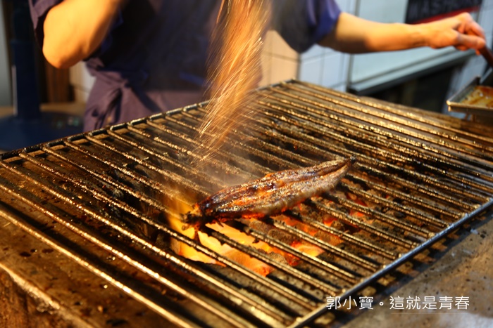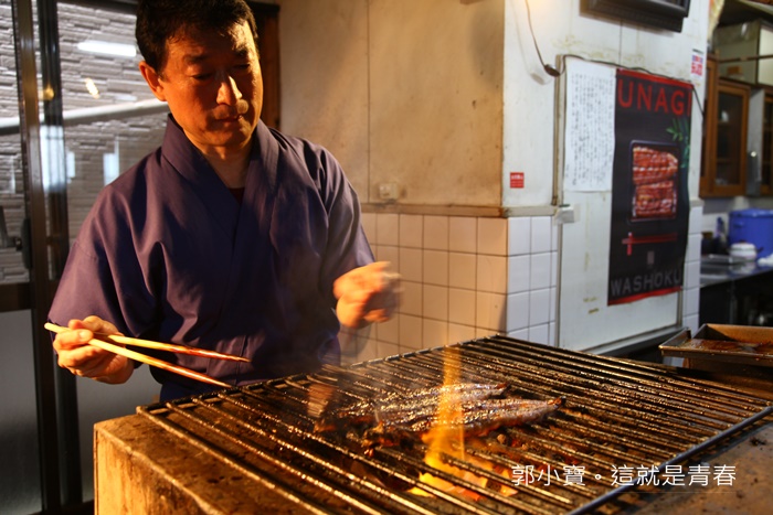 | 詢問了一下可不可以拍師傅在燒烤鰻魚的照片,得到爽快的答覆後讓我超開心的,因為日本大多都不准拍攝的,且通常很少可以看到師傅在燒烤鰻魚,千力鰻魚飯的燒烤鰻魚處就在入口處。 |