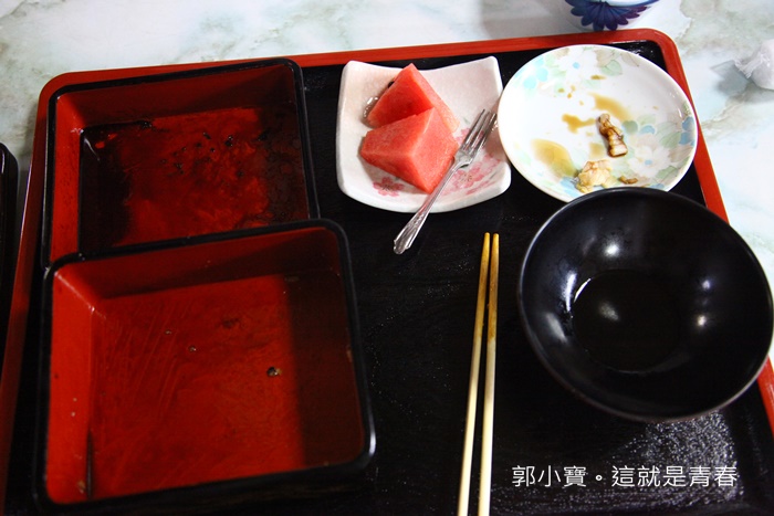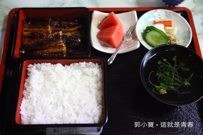 | 因為不知道還會不會來這邊,所以就狠下心直接點了最好的鰻魚飯,上來的是一整套的套餐,便當盒相當的精美,我有時候超愛日本這雙層的餐盒,看起來就會讓心情變好,打開飯盒就可以聞到黏膩的醬汁香氣,上層是兩大片的鰻魚,下盒是白米飯,還有小菜跟水果,一碗鰻魚肝的湯品。 |
