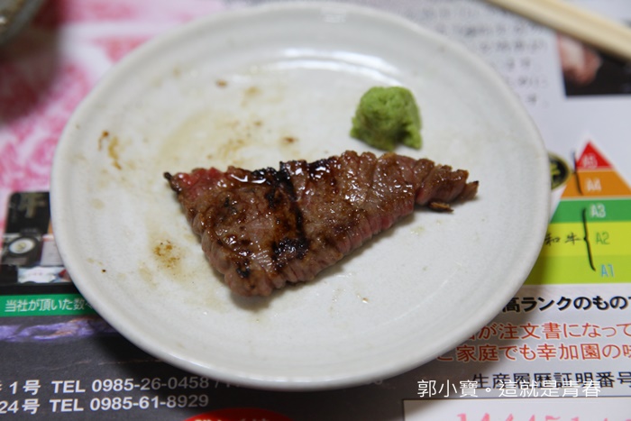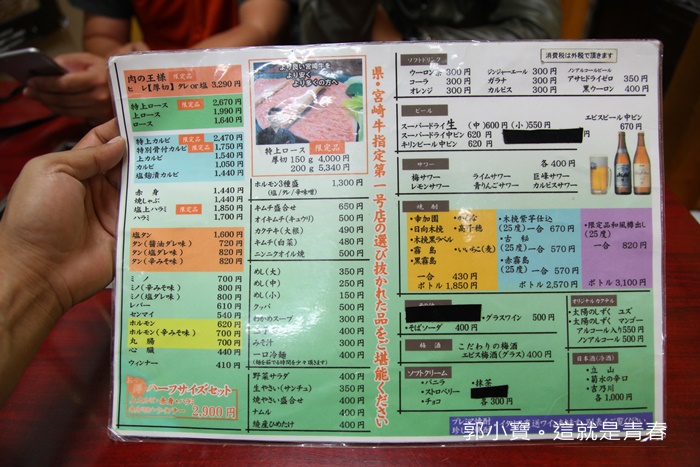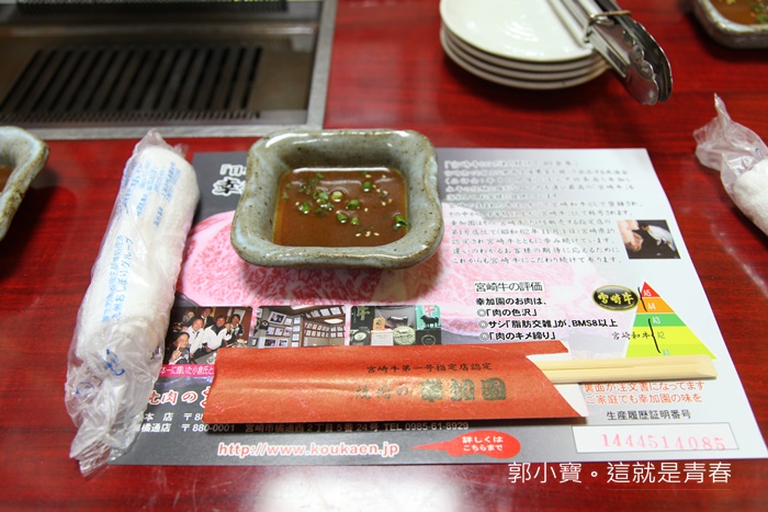 | 餐墊紙上面就詳細的介紹了這一家店跟宮崎牛肉等級的差別,基本上我來日本吃燒肉是很少用到它們的醬汁的,我個人比較喜歡享受原味。 |