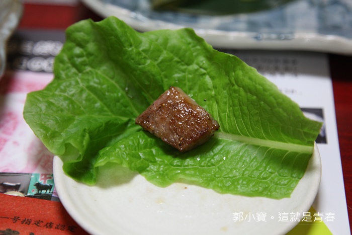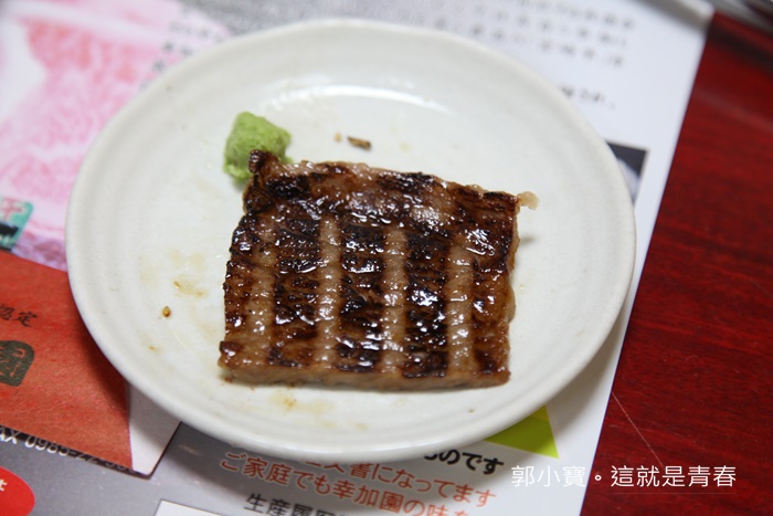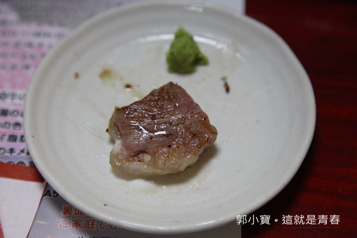 | 一口吃下果然油脂滿多的,重點是油脂非常的鮮甜,雖然日本很多牛肉油脂都很豐厚,但是可能我們吃過太多和牛,要像這樣吃到又油又甜的牛肉相當不容易,這一塊也有咀嚼感,真的很美味。 |