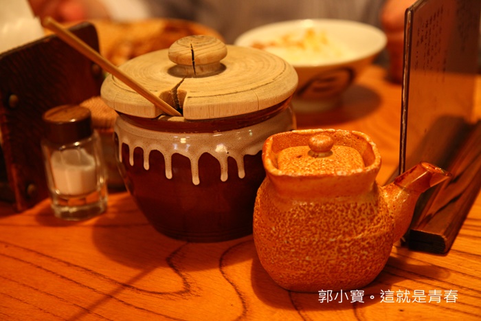 | 因為燈光真的太昏暗了,所以這次照片都超黃的,大家就多多忍受一下這看起來超黃的照片,桌上除了有店家特調的豬排醬以外,另一罐也是店家特調的醋。 |