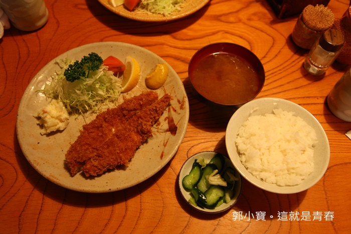 | 這一張照片就是定食全部的照片,除了炸豬排本身主以外,加上白飯跟湯品還有小菜,小菜醃小黃瓜爽口開胃,味噌湯品則是普通,高麗菜絲沒有續加,所以不知道可不可以續加,不過看現場都沒有人續加,所以應該是不行。 |