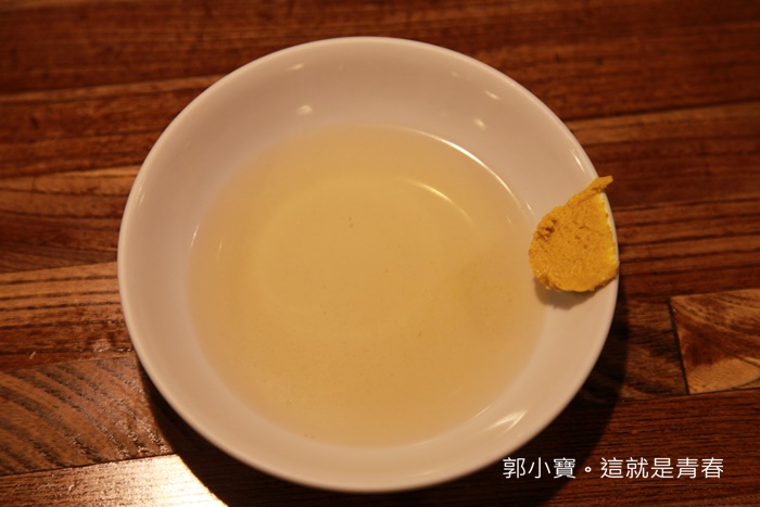 | 每個人都會有一小碟的盛盤,裡面加了些許的高湯抹上黃芥末,好費工的感覺,湯其實喝起來沒有甚麼味道,我超懷念台灣黑輪攤的湯頭XD