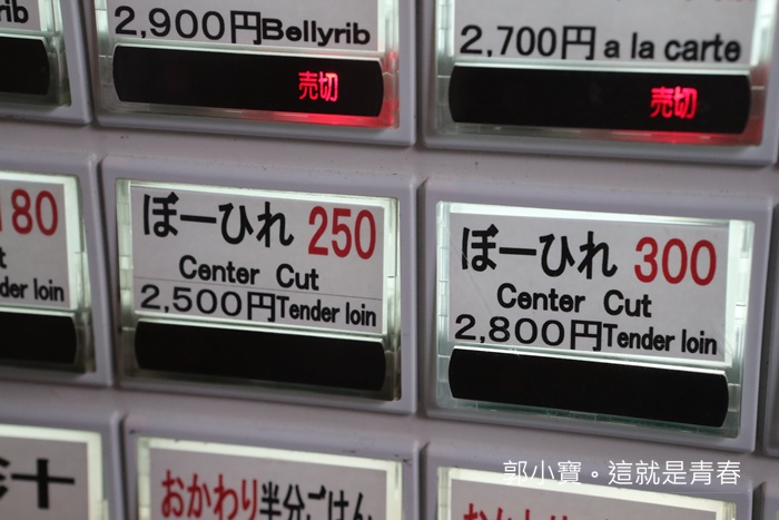 按鍵上的紅字代表的重量,像我點的ぼーひれ套餐就是豬排250克的重量,2500日幣