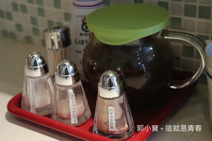| 桌上的調味品沒有很複雜,豬排醬是用玻璃壺裝的,其他的都是各種鹽居多。 |