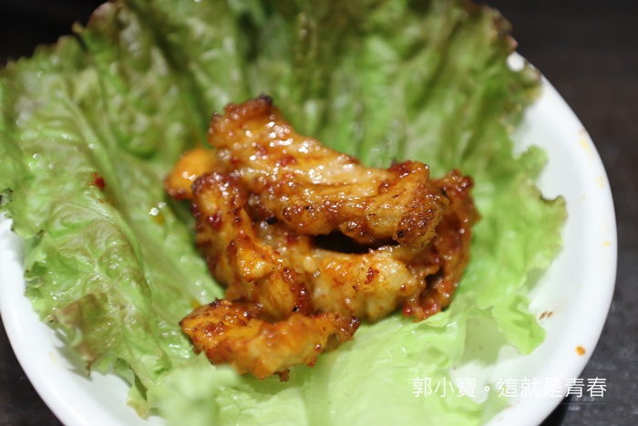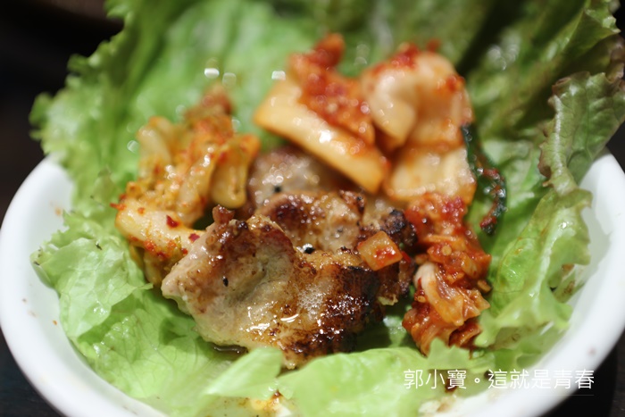 | 夾上泡菜跟五花肉包在生菜裡面,就是最美味的韓式燒肉口味啦,真的太好吃了,因為提供的小菜很多,所以一路上就是生菜跟五花肉狂配其他小菜,一口接著一口簡直停不下來。 |