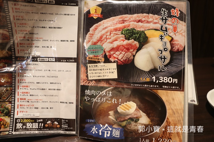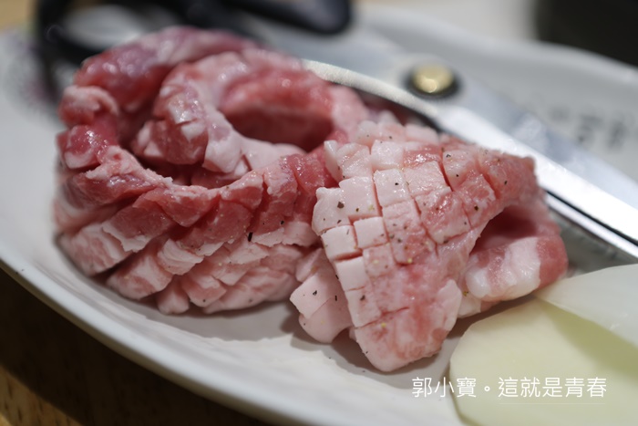 | 這間店的主打五花肉就是招牌上看到的蜂巢五花,這一帶的韓式燒肉店現在幾乎都把五花肉處理成這樣,形成了一股風潮。 |