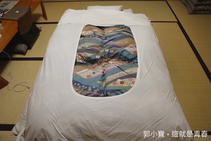 | 吃完飯上來的時候就看到飯店人員把床舖好了,我很喜歡睡這種舖床,尤其是棉被的部分,我個人很喜歡厚棉被最好還帶點重量的那種,日本老旅館大部分都是提供這類型的棉被。 |